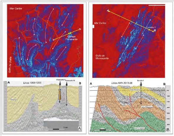 Figura 12 A. Modelo digital topográfico con una sección sísmica característica del sector austral del MCC, caracterizado por el Cinturón Sinú. Se aprecian plegamientos con anticlinales apretados ocupados por diapirismo (con los pozos Floresanto) y sinclinales amplios (localización en Figura 16). B. Modelo digital topográfico con una sección sísmica característica del sector central del MCC que incluye la porción al Cinturón San Jacinto. Se aprecian plegamientos con anticlinales y sinclinales más equivalentes y un diapirismo profundo.