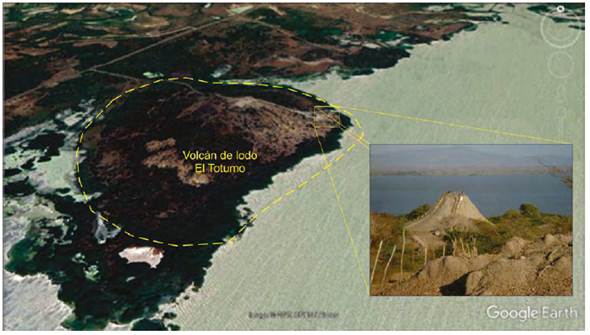 Figura 14 Imagen satelital del diapiro El Totumo (tomada en GoogleEarth con basculamiento hacia el norte), localizado muy cerca del MCC (localización 10°44′40″ N y 75°14′36′′ W) y un detalle de un cono adventicio (gryphon) que es aprovechado como atracción turística.