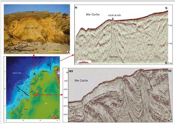 Figura 15 A. Afloramiento de diapiro emplazado en sedimentitas paleógenas de playa Boca Tocino (la barra indica unos 10 m). B. Línea sísmica 82-5100 que muestra un volcán de lodo sobre el lecho submarino. C. Línea sísmica (tomada de la ANH).