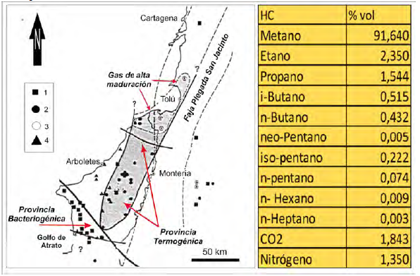 Figura 17 Distribución regional de muestreos geoquímicos de gases biogénicos (1), termogénicos (2), de fuentes de alta maduración (3) y mixtos (4), obtenidos de volcanes de lodo. Los datos de la tabla muestran la composición de los fluidos extraídos en el volcán Arboletes (modificado de García-González et al. 2019).
