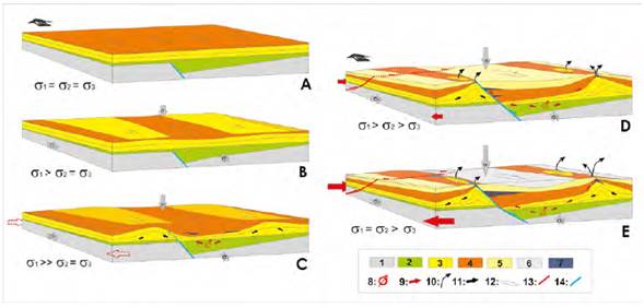 Figura 18 Modelo prospectivo esquemático de hidrocarburos basado en la evolución del diapirismo de lodo sobre la porción austral del MCC, asociado con la progradación de las secuencias terciarias suprayacentes. 1: basamento técnico, 2: Cretácico, 3: Paleógeno, 4: Mioceno, 5: Plioceno, 6: Cuaternario, 7: acumulación de hidrocarburos, 8: cocina, 9: migración de hidrocarburos, 10: emanación de fluidos por diapirismo-volcanes de lodo, 11: flujo diapírico, 12: progradación de la sedimentación hacia el norte, 13: fallamiento sinsedimentario compresional y 14: fallamiento sinsedimentario extensional.
