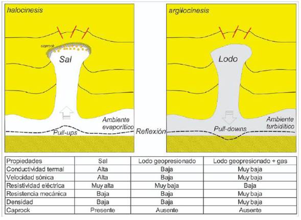 Si bien, tanto el diapirismo halocinético como el argilocinético comparten rasgos morfoestructurales, las características propias de los materiales involucrados difieren en los relevamientos sísmicos (Figura 19). Las diferencias se relacionan con las velocidades de transmisión sónica, las conductividades térmica y eléctrica, la resistencia mecánica y las características de acumulaciones residuales que suelen encontrarse sobre sus porciones cuspidales (cap rocks). A partir de estas diferencias pueden reconocerse diapiros generados en niveles fuentes, depositados en ambientes restringidos y desérticos (evaporíticos) o en condiciones más acuosas y turbidíticas (pelitas).