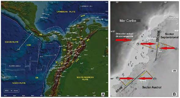 La convergencia sobre el segmento del MCC, comprendido entre el Golfo de Atrato y el área de Barranquilla (Figura 1), genera un campo de esfuerzos con su principal máximo horizontal dispuesto sublatitudinalmente, que determina, en función de la disposición de los sectores austral (SO-NE) y septentrional (NNO-SSE), componentes transpresionales dextrales con intensidades variables (Figura 2). En el sector austral, el carácter más transtensional posibilita el desarrollo de plegamientos de tipo gravitatorio; en cambio, en el sector septentrional el carácter más transpresional favorece el desarrollo de pliegues más elongados y típicamente compresionales. Este contexto determina a partir de su funcionamiento desde el Oligoceno la exhumación del cinturón Sinú- San Jacinto (que en general no supera los 300 m.s.n.m.), el desencadenamiento de deslizamientos gravitatorios con vergencia hacia el norte y la traslación oriental de los abanicos submarinos relacionados con las descargas sedimentarias de los ríos Cauca y Magdalena.