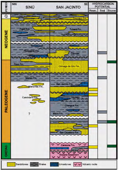 Figura 3 Columna litoestratigráfica generalizada del Cinturón Sinú-San Jacinto y los principales niveles atribuidos con potencial de rocas madres y reservorios de hidrocarburos (tomada de Barrero et al., 2015).