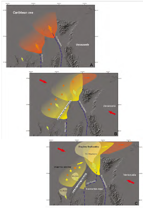 Figura 4 Modelo evolutivo esquemático del Margen Caribeño Colombiano, relacionado con la generación del diapirismo argilocinético (modificado de Rossello et al., 2011). A. Descargas tempranas de los paleo ríos Cauca y Magdalena y avance progradante del litoral. B. Comienzo de la restricción de la descarga del paleo río Cauca por la exhumación del Sinú-San Jacinto y comienzo de la generación de diapirismo de las secuencias infrayacentes (estrellas). C. Bloqueo total y coalescencia tardía del río Cauca sobre el río Magdalena que incrementa la tasa sedimentaria fosilizando los diapiros anteriores (estrellas naranjas) y los que continúan en actividad al sur (estrellas amarillas).