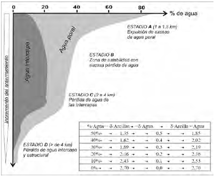 Figura 5 Cálculo estimativo de la densidad de un lodo en función del % de agua contenida. Las densidades son en general inferiores a 2,2 g/cm3, y gradientes térmicos más bajos del orden de 20°C/km. Cuadro esquemático de los distintos estadios de expulsión de aguas de un sedimento-roca en función del soterramiento (adaptado de Bloch et al., 2002).