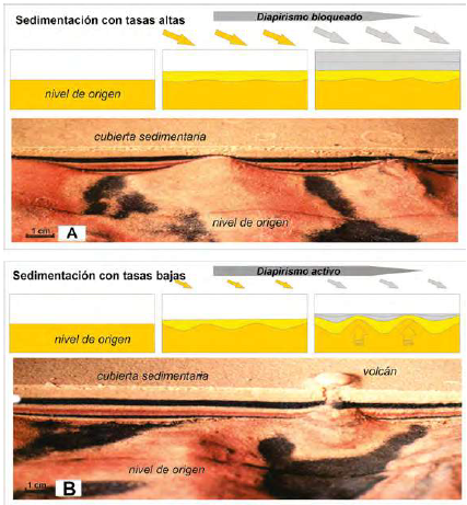 Figura 6 Vistas de los primeros modelos físicos analógicos y esquemas simplificados sobre la generación de diapirismo en función de las tasas de sedimentación de las secuencias suprayacentes (nivel de origen: siliconas; cubierta sedimentaria: arenas). A. Bloqueo del diapirismo por tasa de sedimentación alta. B. Evolución del diapirismo sinsedimentario incentivado por tasa de sedimentación baja. La escala: 1 cm (tomado de Cobbold et al. 1989).