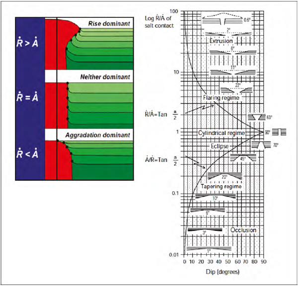 Talbot (1995), basado en el análisis de la relación entre las tasas verticales de acumulación de sedimentos y la velocidad de ascenso del diapiro, estableció que la morfología pasiva del diapirismo salino está moldeada por la propia evolución de su enterramiento, debido a los siguientes procesos: a) la relación entre la velocidad y potencia de la acumulación local neta de los sedimentos suprayacentes (A = depositación menos compactación), denominada tasa de sedimentación (Aggradation = Ȧ) y b) R el incremento neto del relieve ascendente del diapiro (R = ascenso menos disolución) a una tasa de ascenso neto del diapiro (Rise = Ṙ). De este modo, se puede determinar y predecir la morfología del diapiro de acuerdo con las siguientes relaciones (Figura 7).