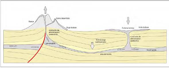 Además de la diferencia de densidad entre los volúmenes que se movilizan desde secuencias fuentes profundas y la cubierta sedimentaria superior más densa, estos procesos argilocinéticos pueden estar estimulados por la compresión tectónica y la presencia de un alto contenido de gases. Vernette et al. (1992) y Stewart y Davies (2006) propusieron que los volcanes de lodo son esencialmente la expresión más superficial de la existencia de fracturamientos que constituyen las vías alimentadoras que los comunican con la unidad estratigráfica que le sirve de fuente para el material que expulsan. Kerr et al. (1970) describen la presencia de volcanes de lodo a lo largo de fallamientos que han controlado su emisión y el transporte hacia la superficie de fragmentos de materiales consolidados areniscosos, producto del arranque de los encajantes (Higgins y Saunders, 1974; Barber et al., 1986; Brown, 1990).