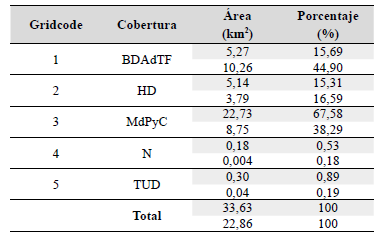 Con base en la clasificación supervisada por el método de RF, en la Tabla 6, se puede observar que la mayor área de cobertura corresponde a Mosaico de Pastos y Cultivos (MdPyC), con 26,131 km2 en el páramo de Merchán y 11,297 km2 en el páramo de Telecom. La segunda cobertura vegetal mejor distribuida es el Bosque Denso Alto de Tierra Firme (BDAdTF), en un mayor porcentaje de área en el páramo de Telecom con un valor del 43,62% respecto al área total del páramo.
