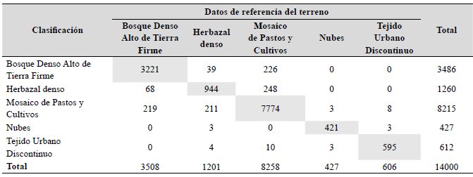 En las CM, se observa que, para el método RF (Tabla 5), la cobertura vegetal Mosaico de Pastos y cultivos presentó un menor grado de precisión dado que obtuvo 7774 puntos correctos de 8215 puntos, de igual manera, Herbazal denso obtuvo 944 puntos de 1260; estos datos permiten verificar la exactitud temática respecto a la clasificación establecida con los datos de referencia del terreno. Es importante resaltar que los valores bajos con respecto a las otras coberturas se deben a la poca área ocupada en la zona, es decir la cobertura de mayor área es la que presenta el mayor número de puntos de control. Con esto es posible inferir que la clase con mayor precisión y agrupación espectral fue nubes, ya que, obtuvo un valor de 421 puntos correctos de 427, seguida de Tejido Urbano Discontinuo y Bosque Denso Alto de Tierra Firme.