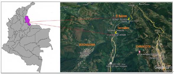 La zona de estudio comprende las fuentes termales del Raizón y Los Termales, ubicadas en los municipios de Bochalema y Chinácota (Figura 1). Se accede desde Pamplona o Cúcuta, por la vía pavimentada que comunica a los dos municipios.