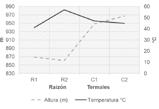 Las temperaturas de las aguas termales oscilan entre los 41-57°C, las cuales concuerdan con lo reportado por Molina (2019); estas varían según la altitud a la que afloran. En la Figura 2, se observa cómo incide la altitud en la temperatura del agua, es decir, cuanto más recorrido del agua al ascender, más libera energía, lo cual es coherente con lo mencionado por Hernández-Romero (2018). Werner (1996) menciona que hay una relación inversa entre la temperatura y la altura. El mayor registro de temperatura se presentó en la fuente R2 del Raizón, a una altura de 861 m.s.n.m., en cambio, en el punto R1 del mismo sitio, que está a mayor altura, se tiene una menor temperatura. En Los Termales, a pesar de encontrarse a mayor altura, se tienen unas temperaturas ligeramente mayores que en el punto R1, lo cual indica que las fuentes hidrotermales presentan mayores propiedades calóricas que en el Raizón.