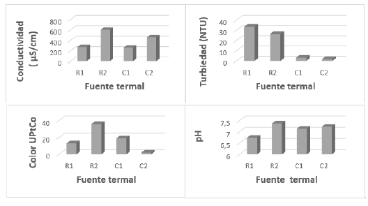 Los valores de turbiedad, conductividad y color difieren entre las dos fuentes, mientras que los de pH son similares. Lo anterior evidencia que se presentan ambientes similares de composición y de circulación de las aguas termales, pero las fuentes del Raizón circulan por litologías diferentes a las que se encuentran en Los Termales. De acuerdo con el Decreto 1076 (2015), Andrade-Arciniegas y Palma-Rueda (2017), Hernández-Romero (2018) y Andueza et al. (2020), los valores de pH encontrados en ambas fuentes se consideran aceptables para uso recreativo.