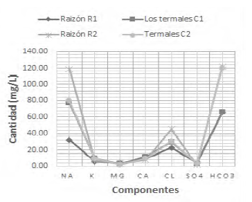 De acuerdo con el diagrama de Schoeller, Figura 4, el alto contenido de sodio (Na) y cloro (Cl) se evidencia en el Raizón y Los Termales. Aunque la variación en las concentraciones de hierro (Fe), magnesio (Mg) y potasio (K) es baja.