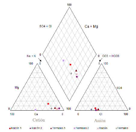 De acuerdo con el diagrama de Piper, se observa que las aguas termales del Raizón presentan valores que fluctúan entre 30% y 45% (SO4 + Cl). Los valores de Ca + Mg fluctúan entre 10% y 40%, mientras que en Los Termales T2 se encontraron valores de 55%, lo cual sugiere que en Los Termales se puede estar presentando mayor disolución de carbonatos, o que las aguas probablemente atraviesan formaciones con mayores espesores de rocas calcáreas.