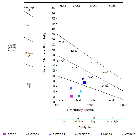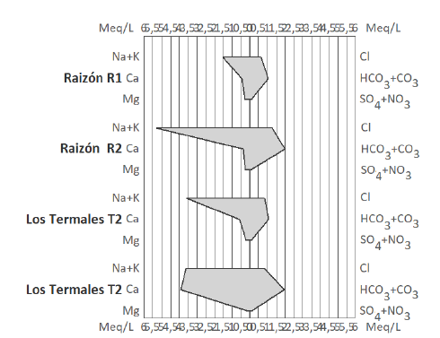 Los diagramas de salinidad indican que la conductividad de las aguas termales es media y que la salinidad es baja para las fuentes de Los Termales y media para las de Raizón. En el diagrama de Stiff