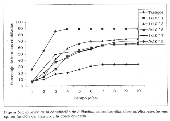 Es de mencionar que el hongo P.lilacinusi esporulo en un 30%de las termitas testigo, lo cual sugiere una probable contaminación mecánica o por manipulación con el hongo (Carvajal 2002). Este valor explica, en parte, los bajos porcentajes de sobrevivencia del testigo que se observaron en el bioensayo.