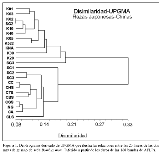 Resumen. Veintitrés líneas de gusano de seda Bombyx mori L, (12 líneas de origen japonés y 11 líneas de origen chino), pertenecientes al banco de germoplasma de gusano de seda del CDTS (Centro de desarrollo tecnológico de la Sericultura) se analizaron utilizando la técnica de Polimorfismo en la Longitud de los Fragmentos Amplificados (AFLP). Se emplearon cuatro combinaciones de cebadores. Las cuatro combinaciones ensayadas, arrojaron 247 bandas con un polimorfismo promedio de 54,6%, las cuales después de ser corregidas según el criterio de Lynch y Milligan resultaron en 168 bandas con un polimorfismo de 90,4%. El dendrograma construido utilizando el algoriTmo UPGMA para los datos de disimilitud, reveló dos grupos muy bien definidos que corresponden a las razas geográficas japonesa y china. El promedio de heterocigocidad fue mayor en las líneas de la raza japonesa, observándose una dispersión mayor en el análisis de UPGMA y de los componentes principales. El estudio de la estructura poblacional, determina que aunque las dos razas no son muy diferentes entre sí, existe un componente de varianza mayor entre los grupos establecidos que dentro de éstos, lo que muestra un grado significativo de diferenciación genética.
