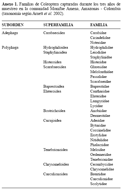 Identificación taxonómica. Los ejemplares recolectados se mantuvieron en etanol al 70%, posteriormente se realizó un montaje en seco, con alfileres entomológicos, montando un ejemplar por cada morfotipo encontrado. Con el material montado se realizó la identificación a nivel de familia, utilizando claves generales y especializadas en este grupo (Costa Lima 1952; White 1983; Papp 1984; Bland y Jaques 1978; Arnett y Thomas 2000; Borror et al. 1989; Arnett et al. 1980; Arnett et al. 2002). El material finalmente fue etiquetado para ser depositado en la Colección Entomológica del Museo de la Pontificia Universidad Javeriana. Es importante anotar que en el muestreo de la época de lluvias del 2003, se presento una pérdida de material, ocasionada por un mal transporte del mismo.