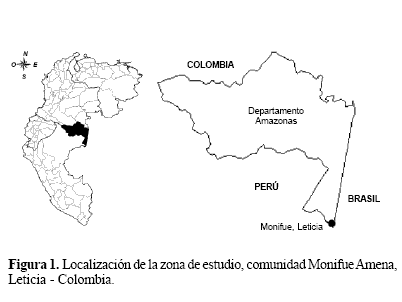 Área de estudio. El trabajo se llevó a cabo en la Amazonía Colombiana, en la Comunidad Monifue Amena (Resguardo Indígena Ticuna-Uitoto), a 71 msnm (4°06’46,25”S - 69°55’52,11”W), a 9,5 km de la ciudad de Leticia, Departamento del Amazonas - Colombia (Fig. 1). En esta zona se presenta un ciclo pluvial monomodal, con una época de sequía de junio a octubre. El muestreo se llevó a cabo en dos unidades de paisaje: Bosque de Tierra Firme (BTF) y Bosque Inundable o Várzea, en época de lluvias (marzo-mayo) y en época seca (septiembre-octubre), durante tres años consecutivos: 2002, 2003 y 2004.