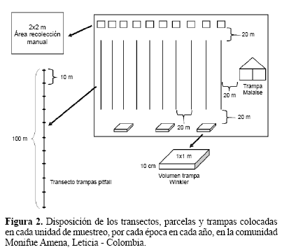 Cada uno de los muestreos tuvo un periodo de 48 horas por trampa, para los dos hábitats. En cada época se realizó un muestreo consistente en la instalación de un promedio de 10 transectos (± 1, el número de transectos varió debido al número de personas que asistían a cada uno de los muestreos) de 100 m, separados 20 m, en cada uno de los dos tipos de bosques. Sobre el transecto se colocaron 11 trampas tipo pitfall de 9 onzas, separadas 10 m entre sí, cebadas con salchichón en descomposición y con alcohol como liquido preservante. Para cada unidad, adicionalmente se seleccionó un área de 2 x 2 m, la cual fue muestreada por tres personas durante una hora con jamás y pinzas.Los muestreos y la colocación de las trampas se hicieron en horas de la mañana en BTF y en horas de la tarde en varzea.