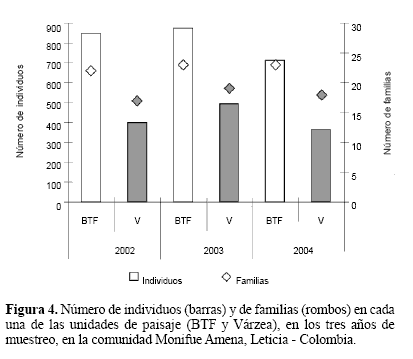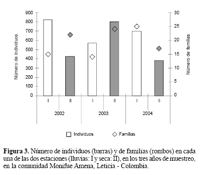 Hubo mayor abundancia en la época de lluvias (2085, 56,49%), que en la época de sequía (1606, 43,51%), a excepción de lo encontrado en el año 2003 donde esta relación se invirtió (Fig. 3). Con respecto al número de familias, se presentó una tendencia a aumentar en época seca (Fig. 3) y en el hábitat BTF (Fig. 4). El porcentaje total de individuos fue mayor en BTF (2423, 65,9%) que en Várzea (1259, 34,1%), mostrando una tendencia a mantener la proporción a lo largo de los diferentes muestreos (Fig. 3). Se encontraron diferencias significativas entre las abundancias y las riquezas de los dos hábitats (F = 0,984; P < 0,003), así como entre las épocas al interior de los años (F = 0,987; P < 0,001).