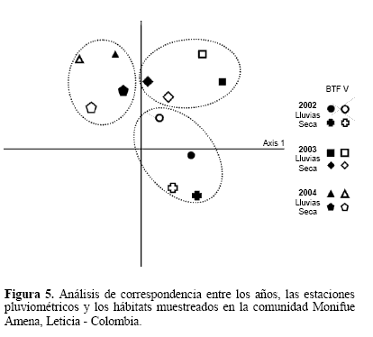 No se encontraron diferencias significativas entre las épocas de mayor o menor precipitación; entre los hábitats al interior de cada año y entre los hábitats y las épocas. El análisis de similitud muestra una relación (> 85%) entre las épocas de lluvias de los años 2003 y 2004, independientemente de la unidad de paisaje y también una relación (90%) entre las unidades de paisaje durante la época de lluvias del año 2002. El análisis de correspondencia tiende a agrupar los muestreos por años y dentro de estos por unidad de paisaje (Fig. 5).