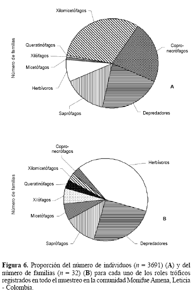 Estructura trófica. Se establecieron ocho roles tróficos a partir de las familias recolectadas, dentro de los cuales el que presentó mayor abundancia correspondió a los xilomicetófagos (32,1%), seguido por los copro-necrófagos (22,3%) y los depredadores (21,7%), mientras el resto de roles presentaron números bajos de individuos (Fig. 6A). Con respecto a la riqueza de familias se encontraron valores diferentes reflejando una composición no consistente con la abundancia; el rol que mayor número de familias presentó fue el herbívoro con 13 (40,6%), seguido por los depredadores con ocho (25%) y los saprófagos con cuatro (12,5%), mientras el resto de roles presentaron un número bajo de familias (Fig. 6B). No se presentaron familias con hábitos parasitoides.