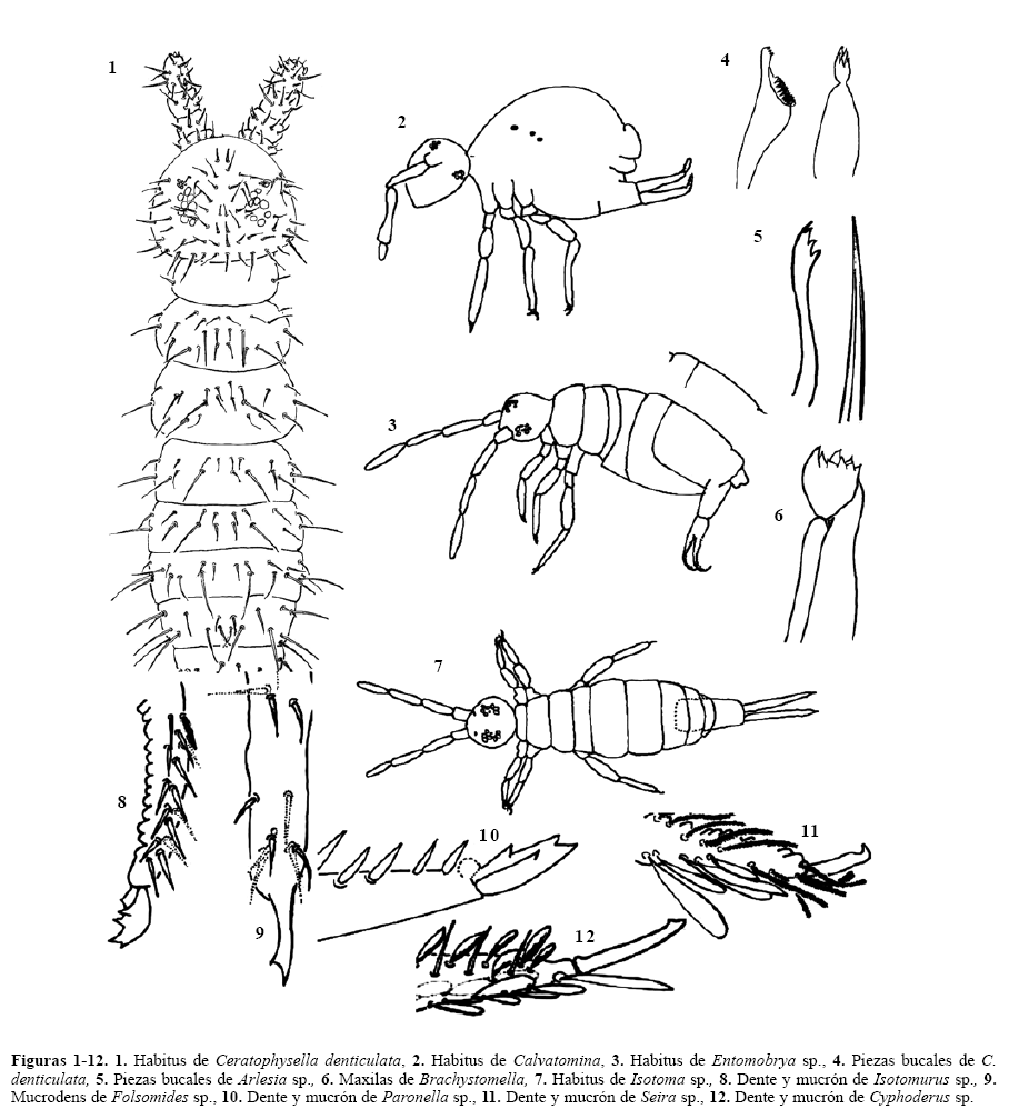 Las prácticas agrícolas influyen sobre la composición y abundancia de los artrópodos edáficos, principalmente en los ácaros y colémbolos (Cutz-Pool 2002). Los colémbolos, o colas de resorte (Hexapoda: Collembola), son muy sensibles a las modificaciones ambientales (Deleporte 1981; Guinchard y Robert 1991). Además, el grupo se caracteriza por la variedad en su dieta (Faisal y Ahmad 2005). Por esta y otras razones han sido considerados excelentes bioindicadores de integridad biológica en el suelo (Bonnet et al. 1976).