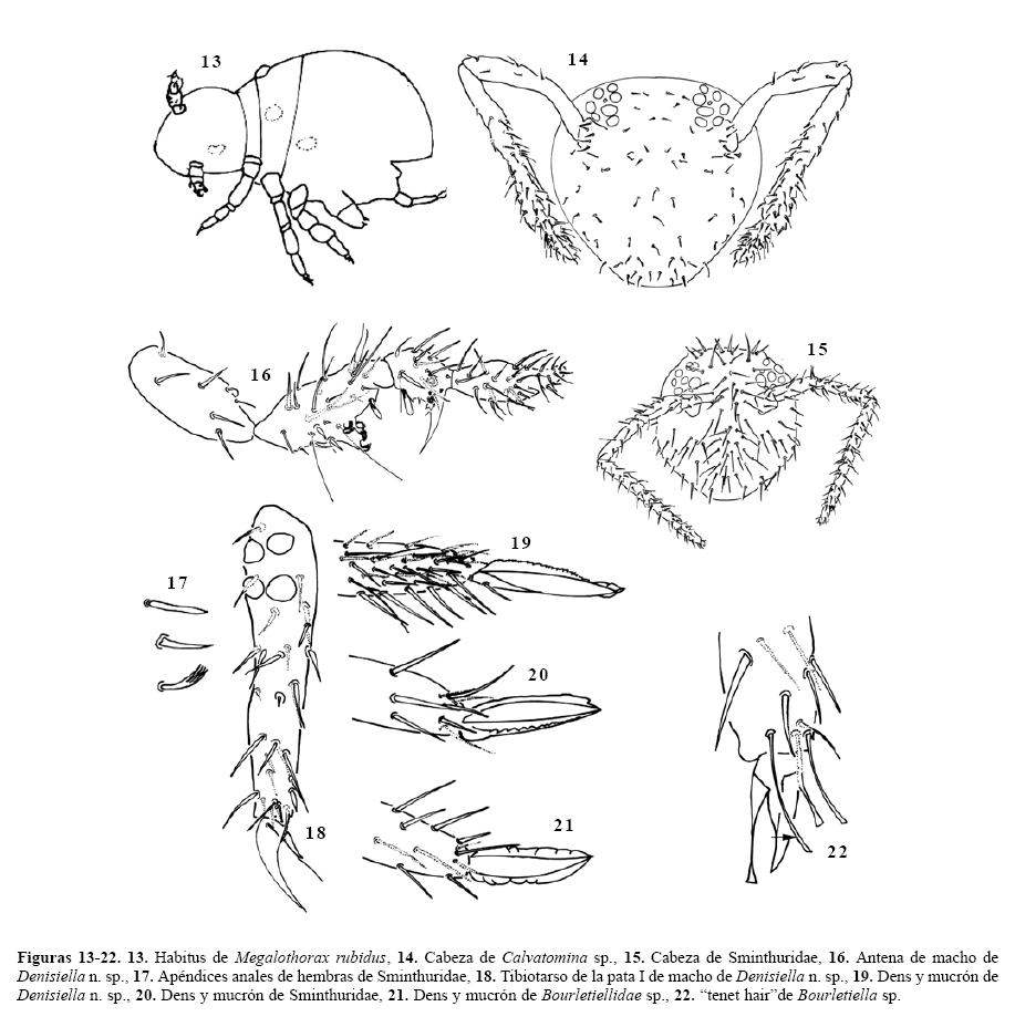 Symphypleona. De las 10 familias registradas a nivel mundial hay ocho para el Neotrópico. En este trabajo se reportan las familias Bourletiellidae, Dicyrtomidae, Sminthuridae y Sminthurididae. Estos colémbolos se caracterizan por su cuerpo globoso (fig.2); sus segmentos abdominales I al IV fusionados y sus apéndices son largos. Dentro de este grupo encontramos la familia Sminthurididae, únicos colémbolos con marcado dimorfismo sexual (fig.16). En este orden se identificaron cuatro géneros. El género Calvatomina (Dicyrtomidae) fue el único reportado para algodón y maíz, mientras que Denisiella, Deuterosminthurus y Sphaeridia son exclusivos de maíz.