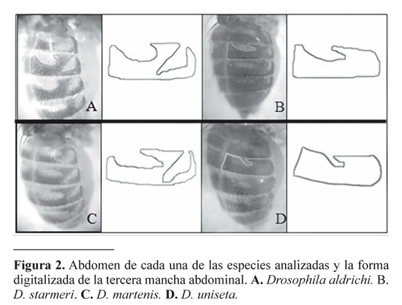 Existe una relación entre la variación de algunas características morfológicas como la pigmentación y los procesos evolutivos que se pueden dar en las especies, la cual se traduce en diversidad fenotípica. La morfometría, una de las herramientas fundamentales en el estudio de las ciencias biológicas y en la prueba de muchas hipótesis evolutivas (Adams et al. 2004; Klingenberg y Monteiro 2005), permite cuantificar dicha variación y separar los componentes genético y ambiental del carácter examinado (Rohlf y Marcus 1993; Castañeda 2000; Jaramillo 2000; Jaramillo y Dujardin 2003). En este trabajo se realizó un análisis elíptico de Fourier a la tercera mancha abdominal de las especies: D. martensis, D. uniseta y D.starmeri recolectadas en Riohacha y Santa Marta en la Costa Norte colombiana y en el desierto de la Tatacoa (Huila) también a D. aldrichi Patterson y Crown, 1940, proveniente de la Tatacoa, con el fin de evaluar su variación, dado que la pigmentación abdominal posee un componente genético que contribuye a la adaptabilidad en ambientes cambiantes y que sirve para la distinción entre razas geográficas (Hollocher et al. 2000; Brisson et al. 2004).