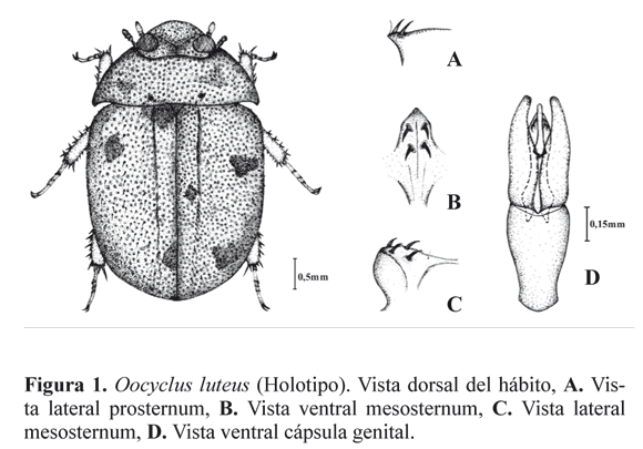 Longitud corporal, largo 4,5-5,0 mm, ancho 3,0-3,4 mm. Oval, convexo dorsalmente. Cabeza, pronoto y élitros marrón, con visos iridiscentes dorados y rojos, puntuación circular verde muy unida que da apariencia verdosa a la superficie. Palpos maxilares, palpos labiales y antenas amarillos a marrón claros, palpos maxilares levemente oscurecidos en el ápice, el resto de las piezas bucales oscuras, escleritos torácicos de marrón oscuro a negro, abdomen amarillo sólido. Cabeza. Surco frontal marcado por completo por una línea de pigmentación negra; puntuación impresa en labro, clípeo y frente no distribuida homogéneamente, separados entre si por la suma de cuatro o menos puntos, no equidistantes, cada punto esta bordeado por círculos de pigmentación verde; puntos pilíferos cerca a la margen interna de ojo, pocos, no muy cortos, fino y aislados. Mentón pentagonal, punteado; II y III segmento del palpo maxilar de igual tamaño, último solo un poco más largo que cada uno de los anteriores, palpo labial tan grande como el último segmento del maxilar, antena un poco más larga que el palpo maxilar. Tórax. Borde lateral de la región media anterior del pronotum testáceo; puntuación como en la cabeza, dos manchas negras a nivel de los ojos cerca a la margen posterior, tan grande como la suma de diez puntos; unos pocos puntos pilíferos en la región media lateral; extremo latero posterior truncado. Élitros con puntos como en pronoto, manchas parcializadas doradas y rojas iridiscentes; estría elitral de puntos pilíferos cerca al borde interno, continúa hasta la tercera parte anterior, en la porción restante disminuye el número de puntos hacia margen posterior; puntos pilíferos alineados, distantes, no muy cortos, finos y solitarios formando filas; otros menos cercanos y no lineales hacia el margen externo ( Fig. 1). Prosterno levemente carenado, la elevación es mayor en el extremo anterior donde presenta dos espinas cortas y sutilmente curvas en la punta ( Fig. 1A). Proceso mesosternal con cuatro espinas no muy largas, gruesas, un poco más que las del prosterno, no equidistantes entre si; pelo fino y largo en medio de las dos espinas posteriores pero más posterior que estas; extremo anterior aguzado ( Fig. 1B); en vista lateral la elevación parte de una curva pronunciada de la tercera parte en la porción basal, elevándose en una curva externa en las 2/3 partes restantes, porción apical obtusa, superficie anterior basal plana ( Fig. 1C). Metasterno con área glabra en forma de gota en la parte media anterior. Patas. Procoxas pubescentes y con espinas no muy largas y gruesas; mesocoxas y metacoxas con pubescencia no muy densa; quinta parte basal del profémur con pubescencia; mesofémur pubescente en esquina basal anterior; tibias de todas las patas con hileras de espinas gruesas y fuertes, que aumentan de tamaño de la basé al ápice. Abdomen. Ventritos con densa pubescencia hidrófuga amarilla. Genitalia. Largo 0,95 mm. Ancho 0,3 mm. Parámeros redondeados apicalmente, levemente curvos hacia el interior, anchos en la base, angostos gradualmente hacia el ápice, más largos que lóbulo central, un poco más largos que lóbulo basal, igual de ancho en su parte media que el mismo. Esclerito ventral del lóbulo medio sobrepasa un poco el ápice del dorsal, apicalmente redondeado y ensanchado en la base; esclerito dorsal del lóbulo medio notablemente más ancho que el ventral, apicalmente con apariencia de punta de flecha, con pigmentación marrón paralela al borde le ápice. Lóbulo basal ancho en la parte anterior, se adelgaza hacia la base formando una escotadura lateral y un semicírculo basal desde las 2/3 de la porción basal ( Fig. 1D).