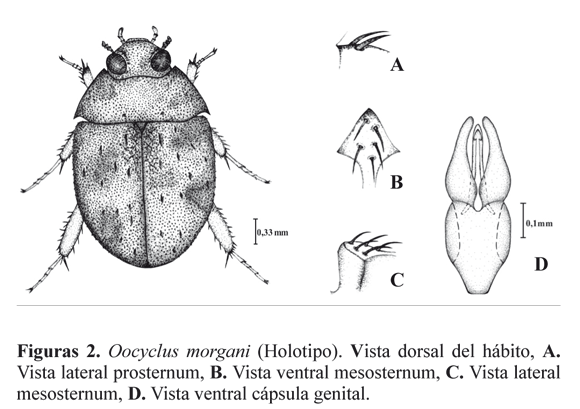 Longitud corporal, largo 3,05-3,39 mm, ancho 2,18-2,40 mm. Oval, muy convexo dorsalmente. Dorsalmente verde iridiscente, visos marrón rojos y dorados; cabeza, notum y élitros con manchas ténues, no uniformes, iridiscentes doradas y rojas. Palpos labiales, palpos maxilares y antenas (exceptuando el mazo) marrón claro a amarillo; mento marrón claro a marrón oscuro pero más claro que piezas cefálicas restantes. Patas marrón oscuro a claro, testáceas; escleritos del prosterno, mesosterno y metasterno de marrón a marrón muy oscuro, uroesternitos marrón oscuro, testáceos hacia margen lateral exceptuando el último. Cabeza. Frente, clípeo y labro con puntuación fina, no homogénea, puntos distantes entre si por uno a dos veces el tamaño de un punto, no equidistantes; siete a nueve setas finas, no muy cortas cerca a la margen interna del ojo, separados por la suma de cuatro a cinco puntos; surco frontal levemente insinuado como una línea de pigmentación negra en la margen anterior interna del ojo; mento cuadrado, levemente redondeado en borde anterior; II y IV segmentos del palpo labial de igual tamaño, IV sutilmente pigmentado en el ápice, III apenas más largo que los otros dos, palpo labial completo solo un tanto más largo que el último segmento del palpo maxilar; antena de tamaño semejante al palpo maxilar, mazo más oscuro que primeros antenomeros. Tórax. Pronoto punteado como en la cabeza, dos manchas azules a nivel de los ojos cerca al borde posterior, unos pocos puntos pilíferos cerca a la margen latero anterior. Élitros punteados como el pronoto; tres estrías elitrales de filas longitudinales discontinuas de pelos finos no muy cortos, compuestas por tres o cuatro agrupaciones, con mayor a menor cantidad de pelos de la parte anterior a la posterior y del borde interno al externo ( Fig. 2), otros puntos pilíferos no alineados en menor cantidad cerca a la porción media externa; borde con espinas muy cortas y pelos finos, último 1/5 posterior de la margen glabro. Prosterno levemente carenado, dos espinas en la porción más elevada del proceso, largas y levemente curvas ( Fig. 2A). Proceso mesosternal sagitado anteriormente ( Fig. 2B), cinco espinas largas y levemente curvadas en el ápice, en vista lateral la carena se eleva partiendo de una leve curva continuando en un ángulo casi recto, obtusa en el ápice ( Fig. 2C); Extremo medio posterior del metasterno con una porción glabra, romboide, aguzada y oscura. Patas. Procoxas con espinas largas como las de la carena, densamente pubescentes; profémur pubescente en la ¼ de la parte anterior; mesocoxas parcialmente pubescente, mesofémur con pubescencia formando un triángulo de la base a la parte anterior; tibias de todas las patas con hileras de espinas gruesas y fuertes, que aumentan de tamaño de la basa al ápice. Abdomen. Ventritos con densa pubescencia hidrófuga. Genitalia. Largo 0,55 mm. Ancho 0,2 mm. Parámeros redondeados en el ápice, más largos que el lóbulo medio, ensanchados del ápice a la base, formando una curva evidente en el borde interno, esclerito ventral del lóbulo medio más corto que el dorsal, puntiagudo, se adelgaza abruptamente en 1/5 de ápice hasta la base; lóbulo basal un tanto más largo que los parámeros e igual de ancho en la mayor amplitud que estos, se adelgaza en 1/3 basal formando semicírculo en la base ( Fig. 2D).