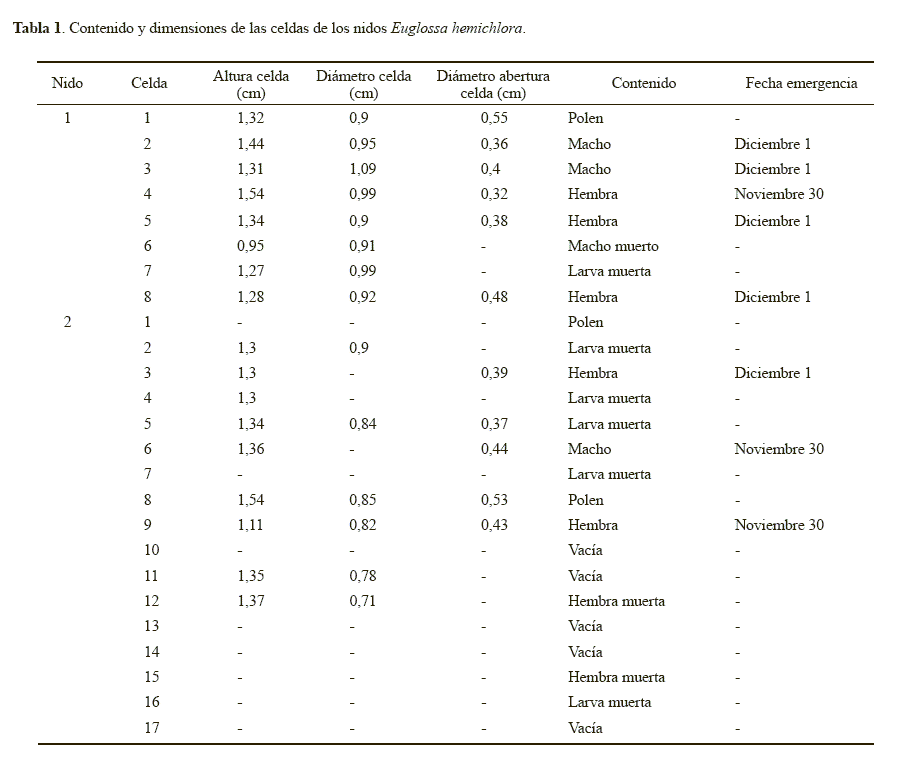 Los nidos trampa son cavidades artificiales con dimensiones particulares que ofrecen un espacio apto para el desarrollo de nidos por parte de hembras de Euglossini, entre otros (Garófalo 1992; Garófalo et al. 1992). Mediante nidos trampa se obtuvieron dos nidos de Euglossa ( Euglossa) hemichlora Cockerell, 1917 en el Municipio de Floridablanca, Santander-Colombia (7°04’N, 73°05’W), en la vereda Casiano, a una elevación de 1600 msnm, el 3 de octubre de 2004. Los nidos estaban construidos en dos cajas cilíndricas hechas en madera de Caracolí (Anacardium sp.) de 5,85 cm de diámetro, con un espesor de las paredes de 1,10 cm y 4,40 cm de alto con un orificio de entrada de 0,5 cm. de diámetro ubicado en un lado de la caja a pocos centímetros del piso. Las dos cajas se trasladaron al cepario del Departamento de Biología, Universidad Nacional de Colombia, Sede Bogotá, donde se mantuvieron a 26ºC y selladas con cinta transparente. Se revisaron diariamente y se registró la fecha de emergencia de cada adulto. Éstos se prepararon e ingresaron en la colección del Laboratorio de Investigaciones en Abejas (LABUN), Universidad Nacional de Colombia. Después de la emergencia de todos los adultos se realizó la disección y medición de altura totales el ancho en la mitad de la celda y diámetro de abertura de las celdas. Se extrajo el alimento larval en celdas abiertas en proceso de aprovisionamiento y se preparó según Herrera y Urrego (1996) para análisis palinológico.