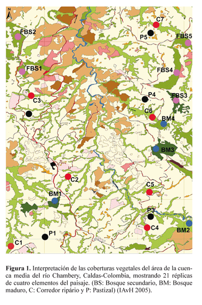 Área de estudio. La cuenca media del río Chambery (5 o18´N, 75 o 28´W) se encuentra al norte del departamento de Caldas entre los municipios de Aranzazu y Salamina, abarca un rango altitudinal entre 1700 y 2100 msnm, precipitación de 2000 a 4000 mm/año con dos temporadas de lluvia y dos temporadas secas; temperatura media anual entre 12o y 20oC. La zona de vida corresponde a bosque muy húmedo montano bajo (Bmh-MB) (Jiménez et al . 2008a). El área de estudio se considera un paisaje ganadero (Jiménez et al . 2008a) y cubre una extensión de 2500 Ha (Fig. 1). Se eligieron cuatro tipos de elementos del paisaje para la caracterización de la diversidad de hormigas: bosque maduro (cuatro réplicas), bosque secundarío (cinco réplicas), corredor riparío (cobertura vegetal que circunda ríos y riachuelos - siete réplicas) y pastizal (cinco réplicas).