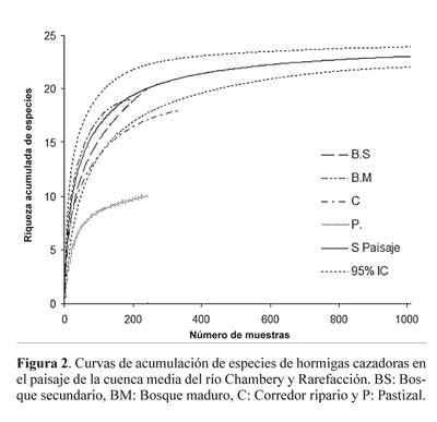 La riqueza y la composición de especies en un ensamblaje son dos características que pueden arrojarnos patrones diferentes en un área, debido a que el número de especies y la identidad pueden tener efectos diferentes sobre el ecosistema (O´Connor y Crowe 2005). En la cuenca media del río Chambery se recolectó el 86.95% de las 23 especies registradas por Jiménez et al . (2008b), obteniéndose en total 25 especies. La ausencia de Amblyopone degenerata Borgmeier, 1957 y de una especie perteneciente al género Hypoponera recolectadas por Jiménez et al . (2008b), puede obedecer a que estos autores muestrearon otros elementos del paisaje como cercas vivas, plantaciones de fríjol, cafetales con sombra y cafetales asociados, los cuales no se tuvieron en cuenta en este trabajo.