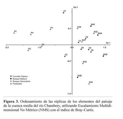 El análisis de escalamiento multidimensional no métrico (NMS) indicó que un ordenamiento en dos dimensiones es adecuado para representar los datos (Fig. 3). Los pastizales se separaron de los elementos con mayor cobertura vegetal, bosques y corredor ripario, y a su vez, éstos se agruparon a lo largo del eje 1 (Stress promedio = 42,306; Stress mínimo = 25,1; P < 0.05), sin encontrarse diferencias entre las réplicas (BM, BS, C), aunque éstas no se agruparon como elementos discretos.