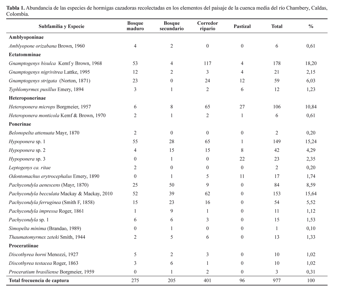 El presente trabajo cuantifica la riqueza y compara la composición de especies de hormigas cazadoras, en el mosaico de parches de vegetación natural y pastizales que conforman el paisaje rural de la cuenca media del río Chambery (Caldas). Además propone especies indicadoras de los tipos de hábitat estudiado (bosque maduro, bosque secundario, corredor ripario y pastizal).