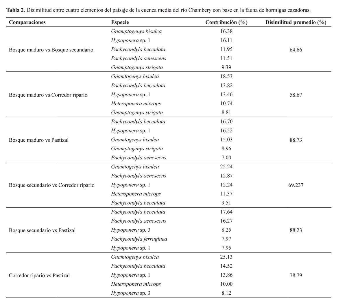 Composición del ensamblaje. El análisis de similitud detectó diferencias significativas en la composición de especies de hormigas cazadoras entre todos los elementos del paisaje (ANOSIM R global = 0.1606, P < 0.001; MRPP, T = -64.38 A = 0.082 δ = 0.76, P < 0.001). Los dos tipos de bosque comparados con el pastizal fueron los elementos con las mayores diferencias en composición (Tabla 2); así, la disimilitud promedio entre bosque maduro y pastizal (88,73%) fue semejante a la encontrada entre bosque secundarío y pastizal (88,23%). Para la primera comparación, las especies P. becculata, Hypoponera sp. 1 y G. bisulca fueron las que más aportaron a la disimilitud (16,70%, 16,52% y 15,03% respectivamente), y para la segunda comparación, también P. becculata además de Pachycondyla aenescens (Mayr, 1870) (17,64% y 16,27% respectivamente) marcaron las diferencias. Por otro lado, el menor promedio de disimilitud (58,67%) se obtuvo entre bosque maduro y corredor ripario.