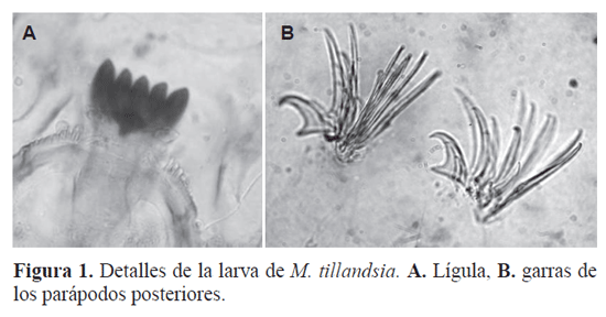 La larva de M. tillandsia (Figs. 1 A-B) no tiene garras oscuras en los parápodos posteriores (Fig. 1A), todas son amarillo pálido. Las garras menores de estos parápodos presentan, cuando más, unos pequeños dientes (3-4) en el margen interno. Habita, típicamente, en el agua retenida en axilas de bromeliáceas. La pupa presenta cuernos toráxicos cilíndricos y plastrón ovoide cubriendo menos de 1/3 de la longitud del cuerno torácico (Fig. 2A), el patrón de coloración marrón claro típico de M. mikeschwartzi (Epler, 1999) esta ausente (Fig.2B). Los ejemplares se ajustaron perfectamente a esta combinación de caracteres que permite separar los ejemplares de M. tillandsia del resto de sus congéneres neotropicales.