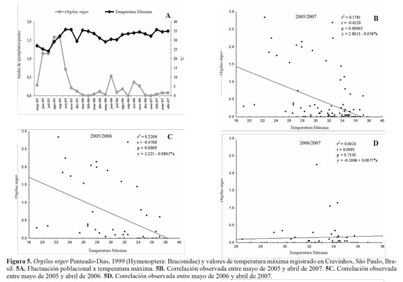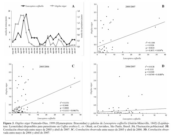 En las figuras 2 a 6 se presentan las relaciones entre la población de O. niger, L coffeella, pluviosidad y temperatura en los periodos comprendidos entre mayo de 2005 y abril de 2006, correspondiente al primer año de muestreo: mayo de 2006 y abril de 2007, al segundo año, y el periodo total de muestreo. Los datos fueron evaluados por año de muestreo para mostrar que en el primer año, las correlaciones entre la población de O. niger y el número de larvas vivas y de galerías de L coffeella disponibles para parasitismo fueron positivas y significativas (Figs. 2-3C) y reflejan un aumento de la población de los parasitoides entre junio y octubre de 2005, relacionada con las altas poblaciones de su hospedero. También en el primer año fueron verificadas correlaciones negativas y significativas entre la población de O. niger y la pluviosidad y las temperaturas mínimas y máximas (Figs. 4-6C). Esta situación no ocurrió al ser analizados tales correlaciones aisladamente en el segundo año de muestreo pues las condiciones abióticas ya mencionadas interfirieron en las frecuencias de O. niger y de L. coffeella (Figs. 2-6D).