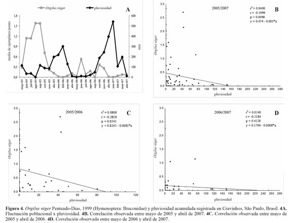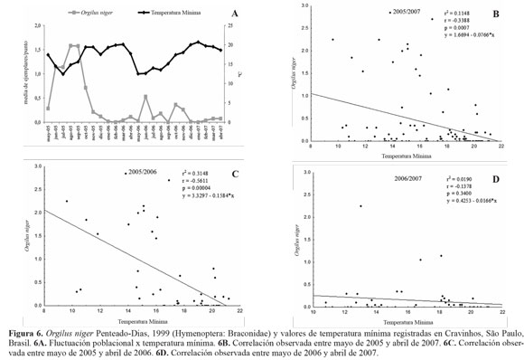 Los análisis de correlación, para todo el periodo de muestreo, entre la población de O. niger y los parámetros evaluados (hospedero, pluviosidad y temperatura) fueron positivos, significativos y menores (Figs. 2-6B). Los resultados probablemente reflejan el doble del volumen de lluvias acumulado entre octubre de 2006 y enero de 2007 cuando comparado con el mismo periodo del año anterior (Fig. 4A) y del aumento de las temperaturas máximas, cuyos menores valores fueron cerca de 5 °C mayores que los registrados en nueve meses del segundo año de muestreo.