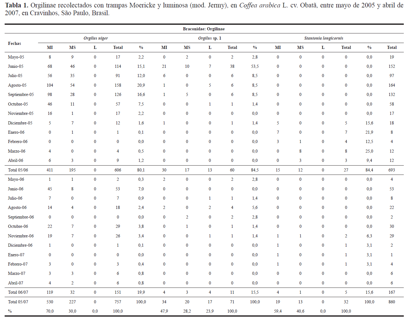 El muestreo de los orgilinos fue realizado entre mayo de 2005 y abril de 2007 con 120 trampas Moericke, de las cuales 60 fueron instaladas a la altura del tercio medio de las plantas y las demás en el tercio inferior (a partir de ahora denominadas como MS y MI, respectivamente). Además, se colocaron dos trampas luminosas (modelo Jermy) en una hectárea de superficie con café (Coffea arabica L. cv. Obatã) (Rubiacea) con cuatro años de edad al iniciar el experimento, en la Fazenda Palmares (21°18'54"S 47°47'39"O), Cravinhos, estado de São Paulo, Brasil. El protocolo de recolecta se encuentra descrito en detalle por Lara et al. (2010). Para controlar la palomilla minadora de la hoja y los ácaros se realizaron aplicaciones de thiametoxam (neonicotinoide) durante mayo de 2005 y tres de clorhidrato cartap + fenpropatrin (piretroide + tiocarbamato) en octubre de 2005, julio de 2006 y marzo de 2007.