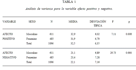 Para el afecto positivo se determinó con base en una ANOVA diferencias estadísticamente sig-nificativa a un nivel de p<0,05 entre los y las adolescentes, encontrando que los hombres obtuvieron una media mayor (X= 32,9 y D.S= 6,02) que las mujeres (X= 31,9 y D.S.= 6,7). Para el Afecto Negativo se encontró igualmente diferencia estadística altamente significativa, en sentido contrario, donde las adolescentes presentan, esta vez, una puntuación media superior (x= 23,4 y DS = 7,28) al de los adolescentes (x= 21,1 y DS= 6,89). Esto indica que los hombres tienen una mayor capacidad de expresar emociones de tipo positivo, mientras que las mujeres lo hacen para las emociones de tipo negativo. tabla 1.