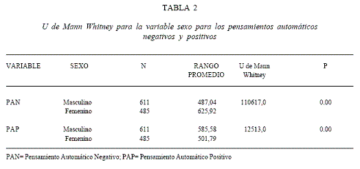 Para los pensamientos automáticos negativos y positivos se encontró diferencia estadísticamente significativa entre los adolescentes y las adolescentes. Como se puede extraer de la tabla 2 las adolescentes presentan puntuaciones mayores que los adolescentes en los pensamientos automáticos negativos y de lo contrario sucede con los pensamientos automáticos positivos, lo cual sugiere que los adolescentes se caracaterizan por pensamientos con alto contenido catastrófico, absolutista y autoderrotista.