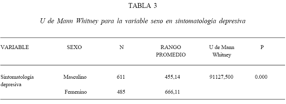 Para la variable sintomatología depresiva la diferencia entre entre los adolescentes y las adolescentes es estadísticamente significativa (p<0,05). Según el anaálisis realizado con la prueba U de Mann Whitney se estableció que las mujeres obtuvieron puntuaciones más altas que los hombres (tabla 3), ratificando este resultado lo establecido en la literatura en este aspecto: las adolescenetes refieren más sintomatología depresiva que los hombres.