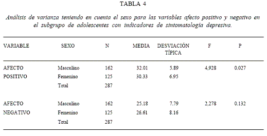Con relación al afecto positivo y negativo se diferencian los adolescentes y las adolescentes solo en el afecto positivo, como se puede extraer de la tabla 4 . Los hombres obtienen puntajes mayores que las mujeres en la manifestación de afecto positivo, aun presentando niveles de sintomatología depresiva. Las mujeres, por su parte presentan menor capacidad de mantener una emocionalidad positiva.