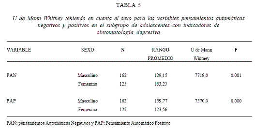 Respecto a los pensamientos automáticos negativos y positivos los adolescentes y las adolescentes con puntuaciones altas en sintomatología depresiva se mostraron de la siguiente manera: Las jóvenes presentan rangos promedios más altos en pensamientos automáticos negativos que los jóvenes a un nivel de significancia de p<0,05 y lo contrario ocurre con los pensamientos automáticos positivos, donde la diferencia está a favor de los hombres con rangos promedios superiores (tabla 5). Esto indica la presencia de pensamientos automáticos negativos cuando hay presencia de sintomatología depresiva, siendo más fuerte esta presencia para las mujeres y puede afirmarse que los hombres conservan la posibilidad de presentar simultáneamente pensamientos positivos.