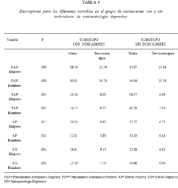 Resumiendo los resultados se tiene que el grupo de adolescentes con indicadores de sintomatología depresiva se encuentra el mismo perfil que se describió para los adolescentes en general y para el grupo sin indicadores de sintomatología depresiva (tabla 6). con exepción de la variable afecto negativo, por no encontrar diferencia estadisticamente significativo, pero presentandose la misma tendencia y dirección e las puntuaciones.